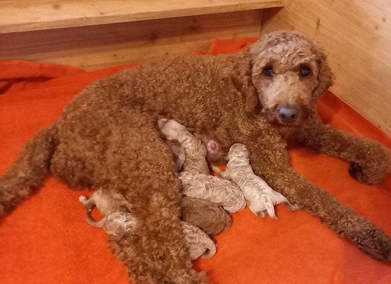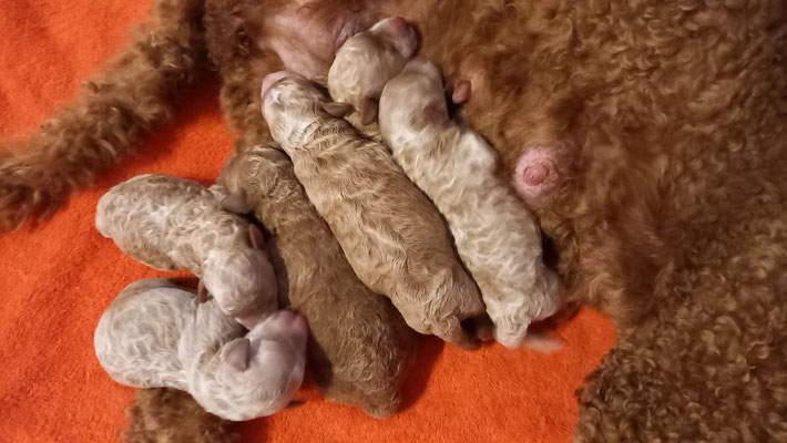 Am 16.09. sind sechs quietschgesunde Nordlichter ins Leben geplumst. Es ist der erste Wurf meiner zuckersüssen Fritzi. Der Rüde ist ein Kleinpudel. Die Welpen werden zwischen 40-50cm. Schöne